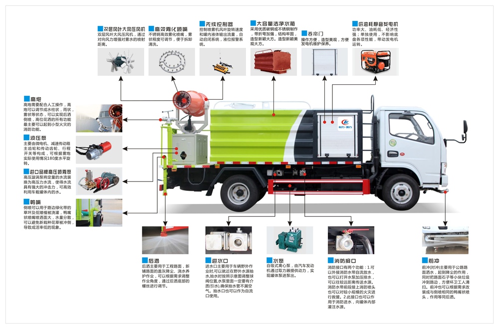 | 其他 | 专用装置为抑尘雾炮,用于城市抑尘.整车长/轴距对应关系为(mm):7000/3600;7200/3800,7350/3950,7450/4050,7500/4100,7800/4400.防护材料:Q235A碳钢,连接方式:左右侧面及后下部防护均采用焊接连接,后部防护断面尺寸(mm):120×50,后部防护离地高度(mm):400.ABS型号/厂家:ABS型号:ABS/ASR-24V-4S/4M,厂家:襄阳东风隆诚机械有限责任公司.当整备质量为6688kg时,选用轴距为(mm):3600/3800/3950;当整备质量为7288kg时,选用轴距为(mm):4050/4100/4400.随底盘选装驾驶室. | ||