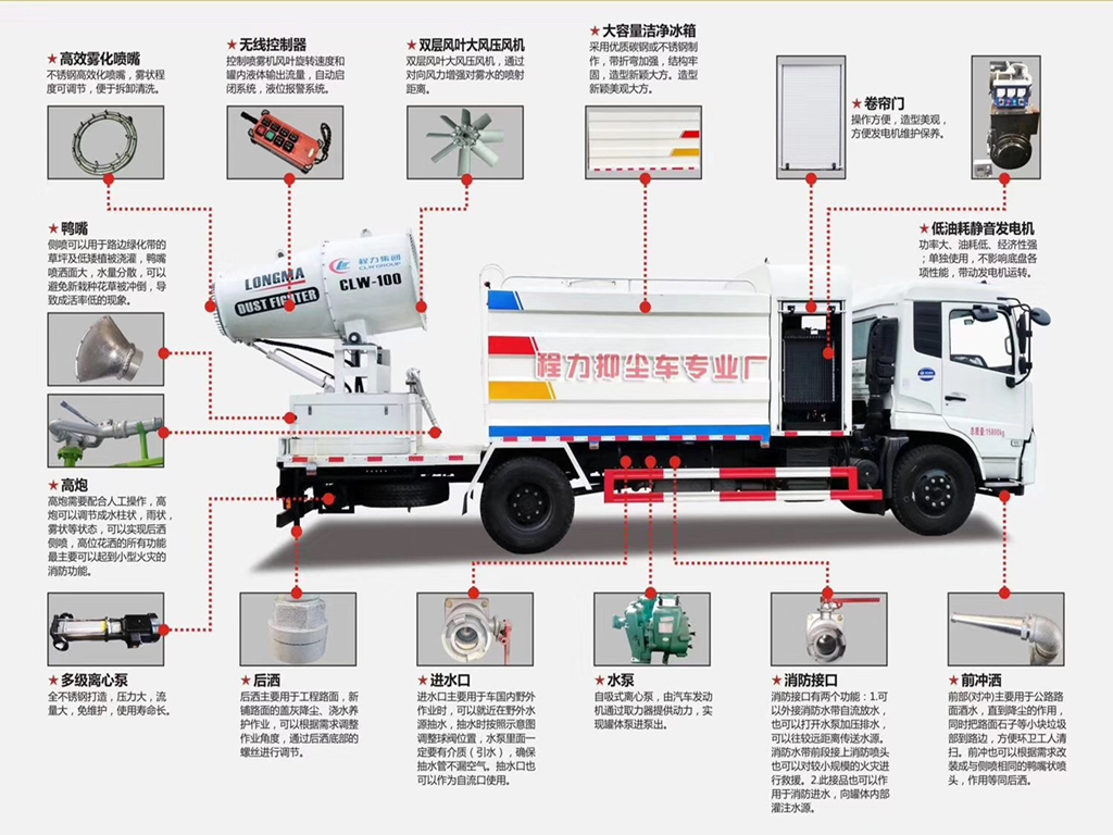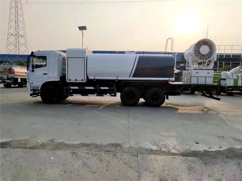 | 其他 | 专用装置为抑尘雾炮,用于城市抑尘.整车长/轴距/后悬对应关系为(mm):10630/4350+1350/3490;10630/4750+1350/3090;11880/5400+1350/3690;11880/5700+1350/3390;11880/5900+1350/3190;防护材料:Q235A碳钢,连接方式:左右侧面采用焊接连接,后下部防护采用螺栓连接,后部防护断面尺寸(mm):120×50,后部防护离地高度(mm):500.ABS型号/生成厂家:3631010-C2000/东科克诺尔商用车制动系统(十堰)有限公司;选装雾炮型号:WF-60/WF-80/WF-100所对应的整备质量分别为:12300kg/13250kg/14000kg。随底盘选装驾驶室。选装外形图片。 | ||