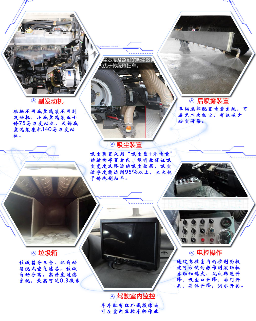 2、操纵便捷:只需要通过驾驶室内的控制面板就可方便的操作副发动机启动和熄火、风机转速升降、吸尘口升降、后门开关、箱体升降,洒水开关,并安装工作视频探头。