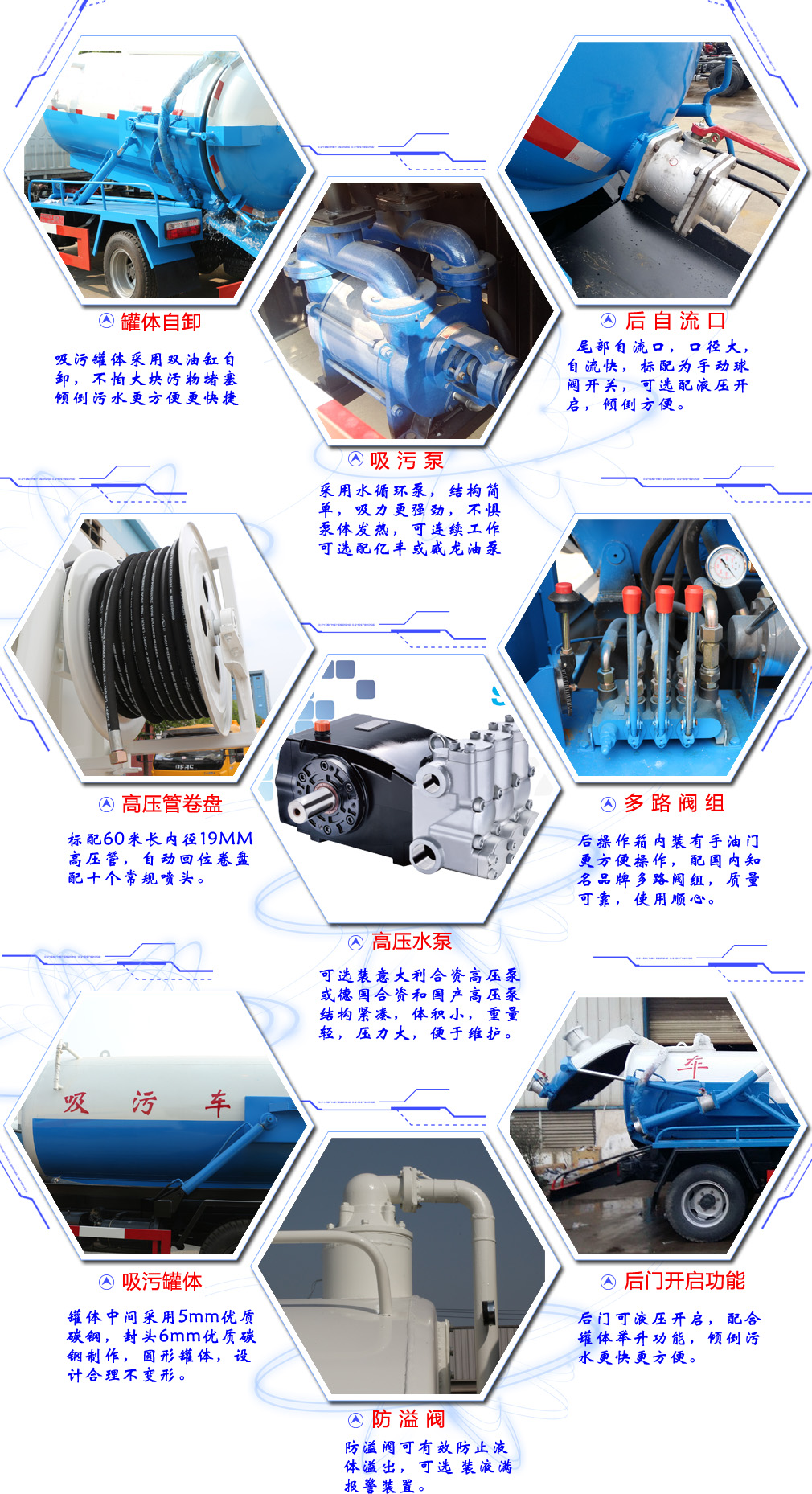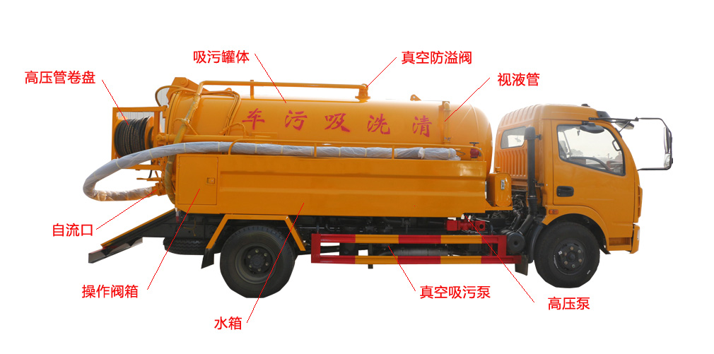 | 其他 | 该车装有取力器,真空泵,高压水泵等;罐体总长(mm):3600,其中水罐前下部用于安装高压泵,水罐罐体有效容积:1.92立方米,罐体外形尺寸(长×直径)(mm):1800×1200;吸污罐罐体有效容积:1.92立方米,罐体外形尺寸(长×直径)(mm):1800×1200;水罐和吸污罐为两个独立罐体,两罐不能同时满载;防护材料:Q235A碳钢,连接方式:左右侧面防护以及后部防护采用焊接连接,后防护断面尺寸(mm):100×50,后部防护离地高度(mm):350;整车长/轴距/后悬对应关系为(mm):5995/3308/1632,5915/2950/1910,5510/2700/1755; 随底盘选装驾驶室,ABS型号/厂家:ABS/ASR-12V-4S/4M/襄阳东风隆诚机械有限责任公司。 | ||