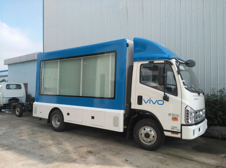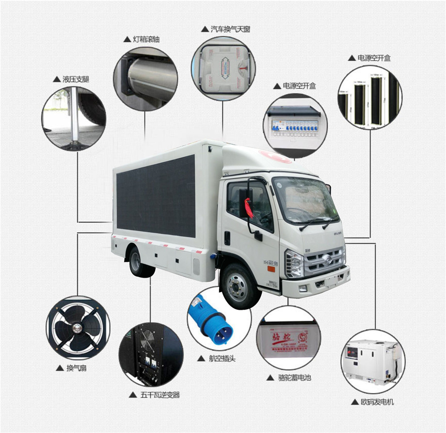 单面(一侧LED屏幕、一侧玻璃滚轴)或双面LED屏幕(P6/P5/P4),尾部单色LED屏幕,翼虎汽油发电机(6.5kw/8kw)或蓄电池供电系统加220V外接电源,电瓶,逆变器,车厢前面前排气扇2个,吸顶排气天窗1个,中控系统(电脑显示器、电脑主机、广播级功放、4个防水音柱、航空外接电源接头、30米外接电源线),豪华木地板/豪华铝地板,易损件(一块LED屏、一块电源、长短5条快速接头电源线)