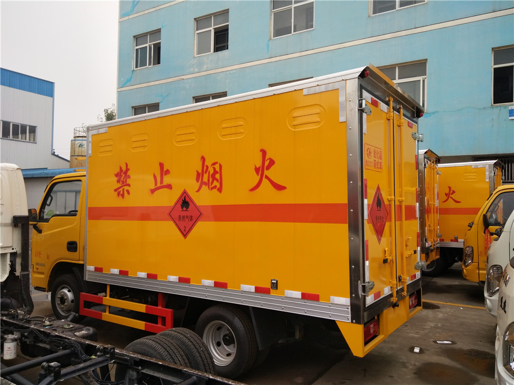 4mm厚的钢板制作,厢体底部铺有防静电胶皮,厢体两侧安装固定货物卡槽或卧环,厢体顶部中间位置安装烟雾报警器,后门及侧门安装防盗报警器,厢体前面铺静电胶皮,带侧门,后双门,厢体颜色根据客户要求变换,带两只灭火器和排气管防火罩、三角危险品顶灯,其余标配。