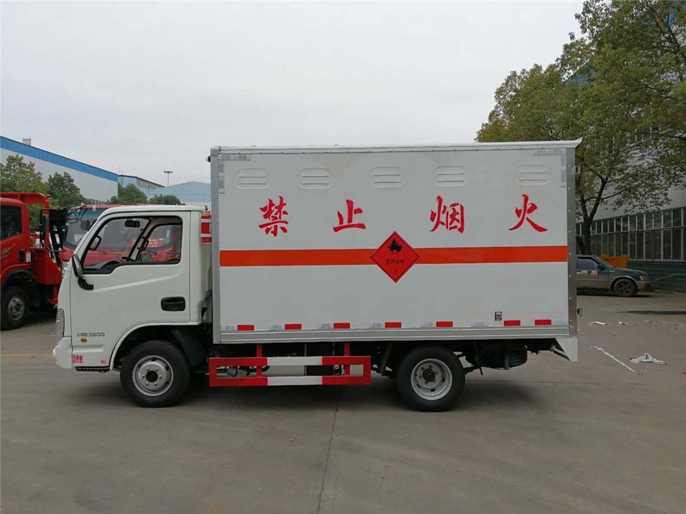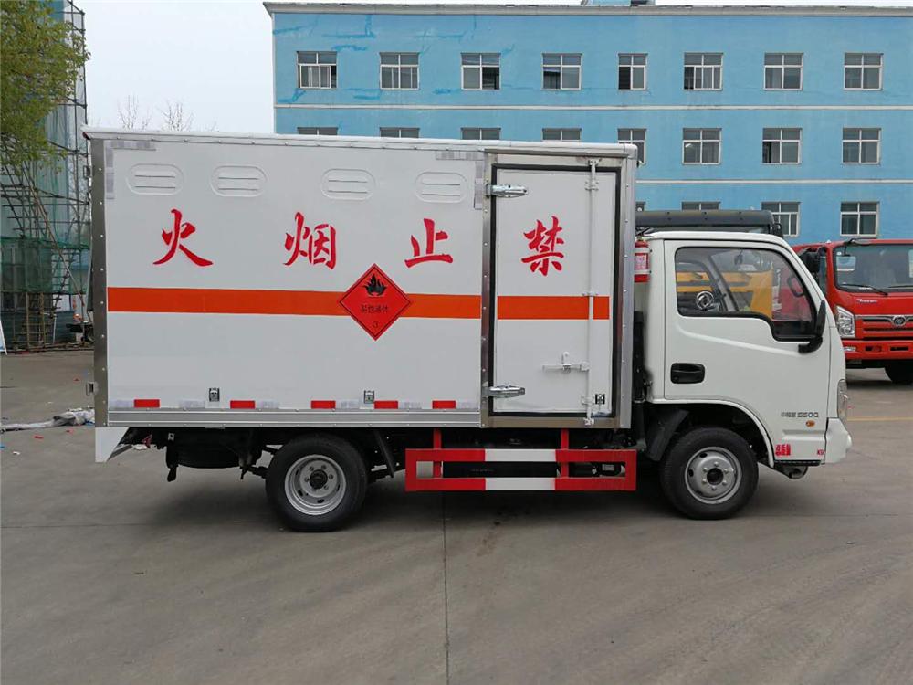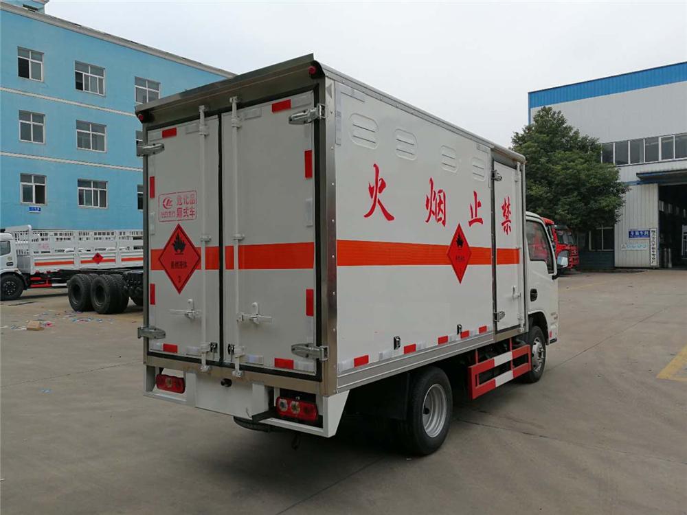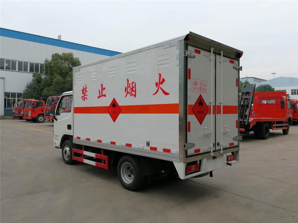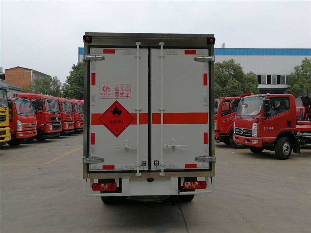 4mm厚的钢板制作,厢体底部铺有防静电胶皮,厢体两侧安装固定货物卡槽或卧环,厢体顶部中间位置安装烟雾报警器,后门及侧门安装防盗报警器,厢体前面铺静电胶皮,带侧门,后双门,厢体颜色根据客户要求变换,带两只灭火器和排气管防火罩、三角危险品顶灯,其余标配。