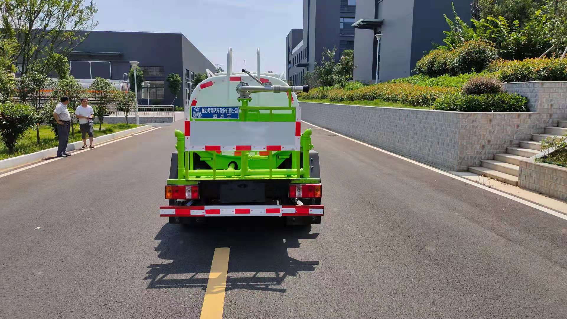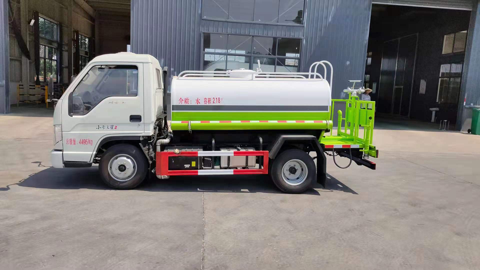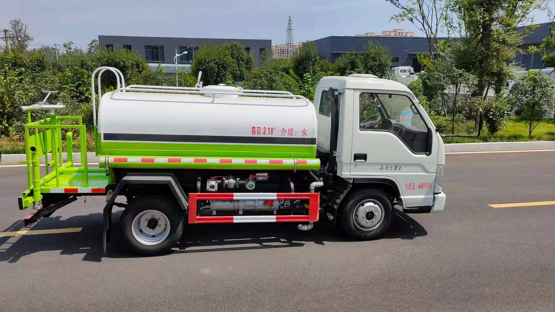 该车采用小卡之星底盘,单排前翻、5档、6.00R16钢丝胎、动转、ABS、可调方向盘、电控熄火、巡航、可调大灯、刹车自调臂,标配前冲(喷)后洒,洒水宽度14~16米,带侧喷,罐体后带工作平台,平台上安装绿化洒水炮,洒水炮可全方位旋转,射程≥28米,可连续调成直冲状、大雨、小雨、毛毛雨,带安全护栏,配备程力威专用洒水泵,泵可自吸自排,安装过滤网,带消防接口,可通过消防栓进水,带自流阀,具有自吸自排功能,垂直吸≥6米;随车选装20米绿化卷盘,可喷洒农药,罐体金属漆。选装消防泵,射程50米。 洒水车同时具有运水功能,若运饮用水,罐体内需做防腐油漆,洒水车泵可起到吸水和加压排功能,也可不通过泵排水