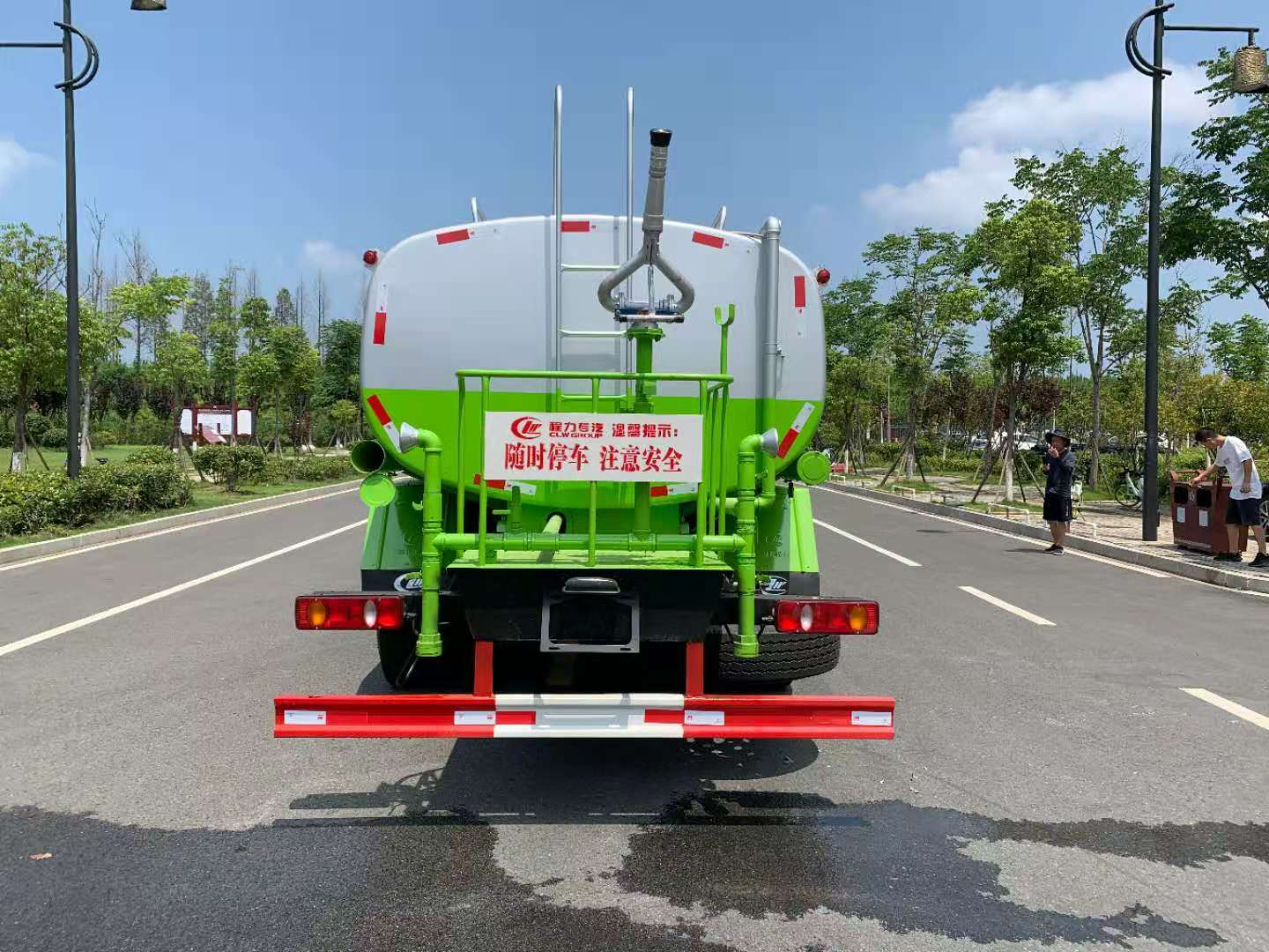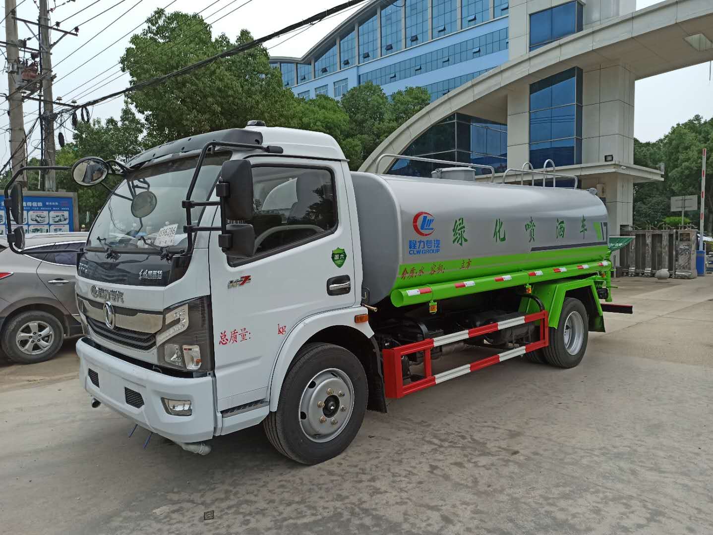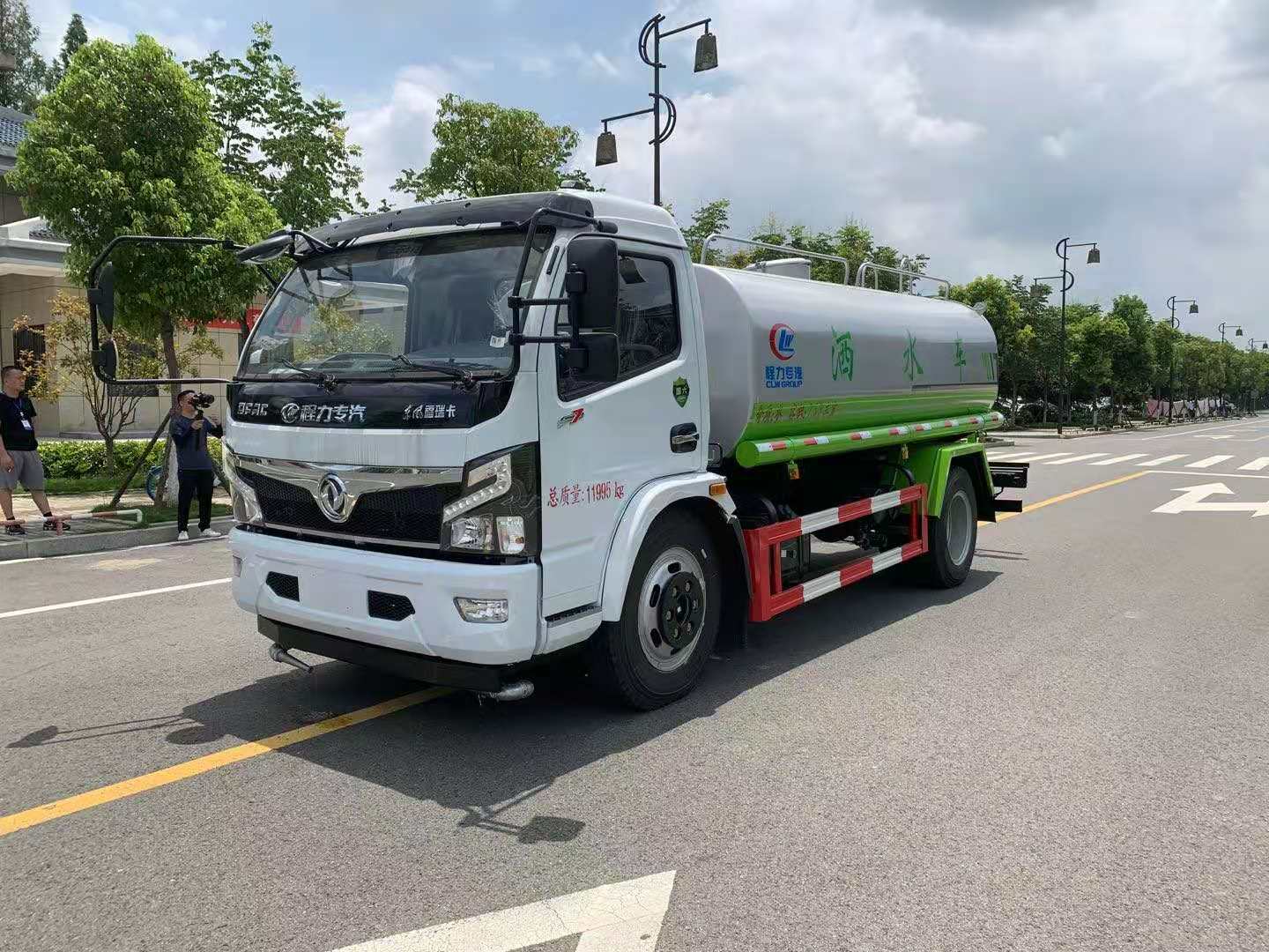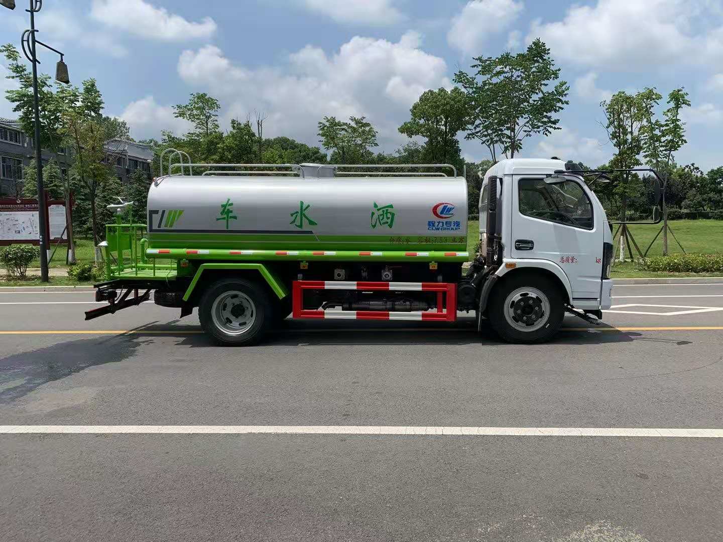 该车采用东风多利卡底盘,6档变速箱,多功能方向盘,电动玻璃,ABS,方向助力,气刹,中控锁,洒水车标配前冲(喷)后洒,洒水宽度14~16米,带侧喷,罐体后带工作平台,平台上安装绿化洒水炮,洒水炮可全方位旋转,射程≥28米,可连续调成直冲状、大雨、小雨、毛毛雨,带安全护栏,配备程力威专用洒水泵,泵可自吸自排,安装过滤网,带消防接口,可通过消防栓进水,带自流阀,具有自吸自排功能,垂直吸≥6米;随车选装20米绿化卷盘,可喷洒农药,罐体金属漆。选装消防泵,射程50米。 洒水车同时具有运水功能,若运饮用水,罐体内需做防腐油漆,洒水车泵可起到吸水和加压排功能,也可不通过泵排水。