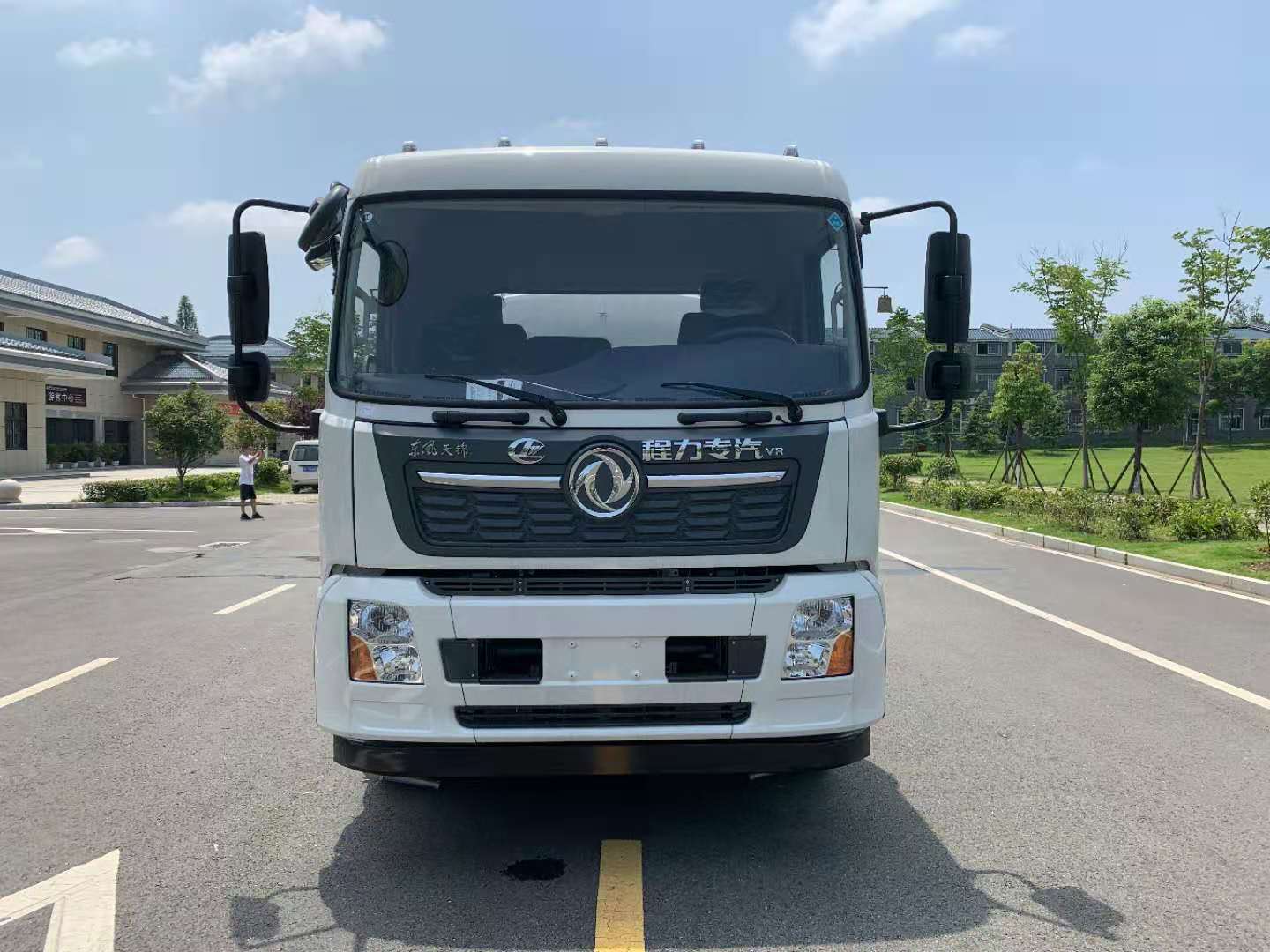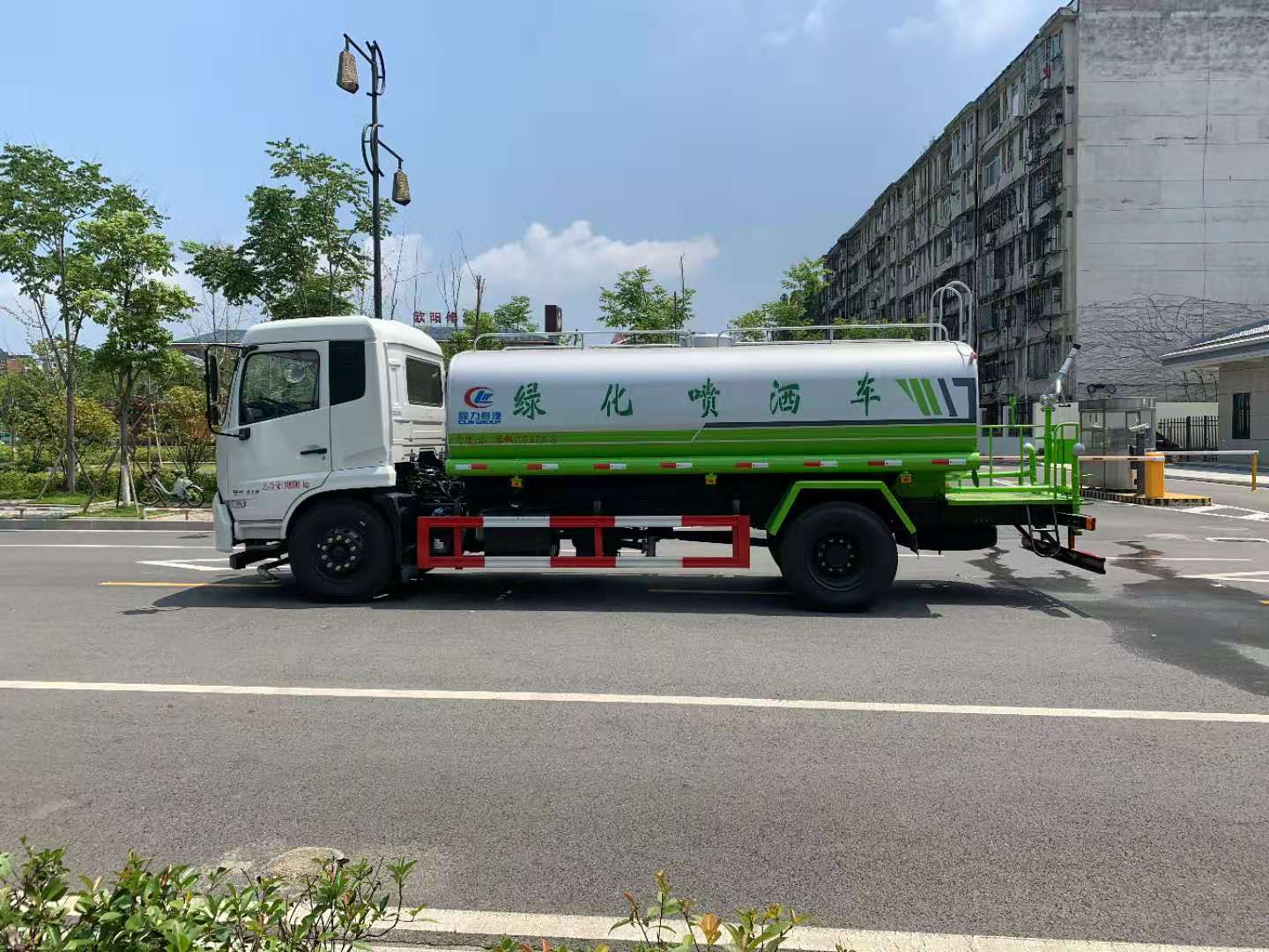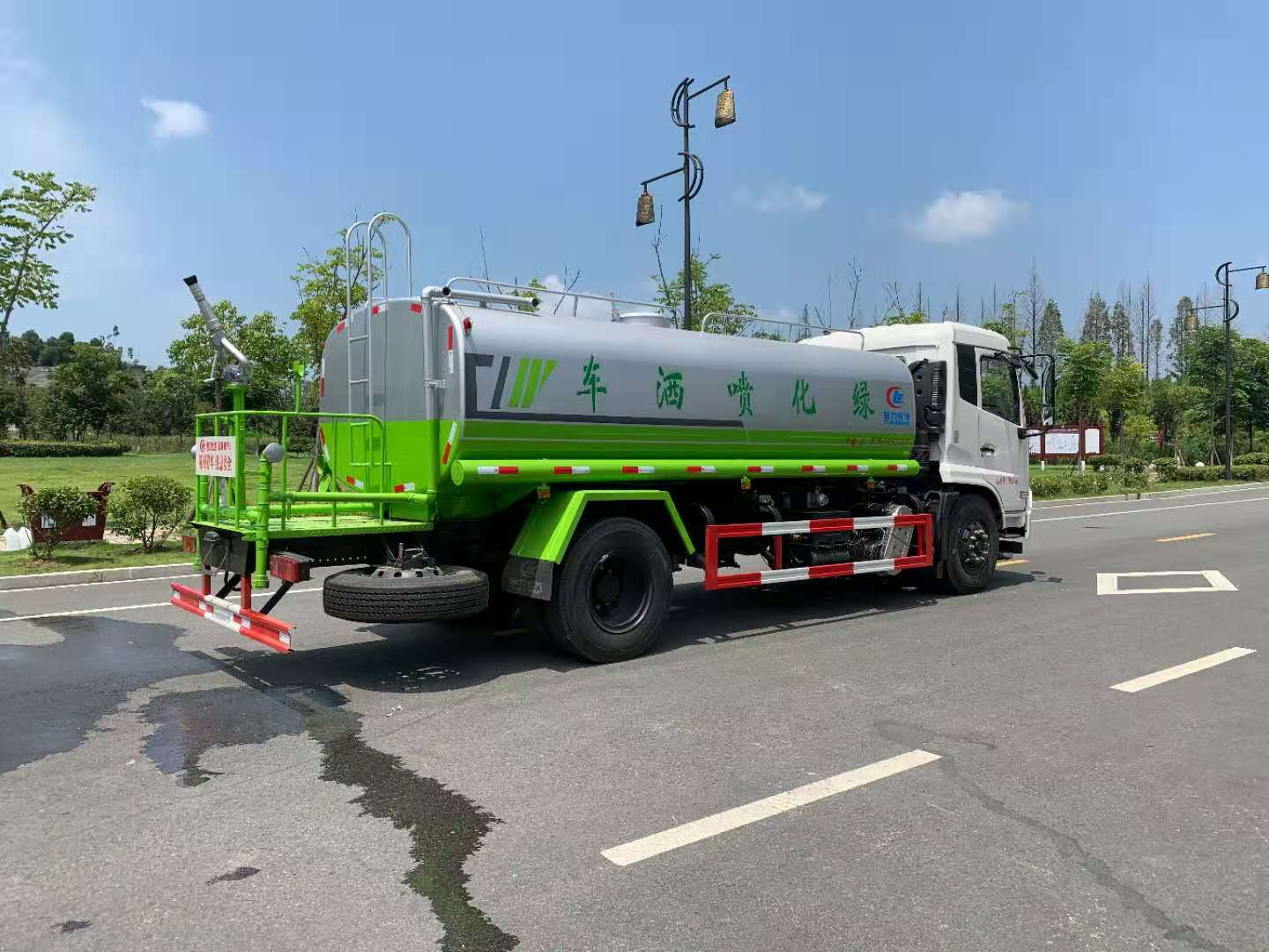 该车采用东风天锦底盘,6档变速箱,电动玻璃,原装空调,ABS,气刹,洒水车标配前冲(喷)后洒,洒水宽度14~16米,带侧喷,罐体后带工作平台,平台上安装绿化洒水炮,洒水炮可全方位旋转,射程≥28米,可连续调成直冲状、大雨、小雨、毛毛雨,带安全护栏,配备程力威专用洒水泵,泵可自吸自排,安装过滤网,带消防接口,可通过消防栓进水,带自流阀,具有自吸自排功能,垂直吸≥6米;随车选装20米绿化卷盘,可喷洒农药,罐体金属漆。选装消防泵,射程50米。 洒水车同时具有运水功能,若运饮用水,罐体内需做防腐油漆,洒水车泵可起到吸水和加压排功能,也可不通过泵排水。