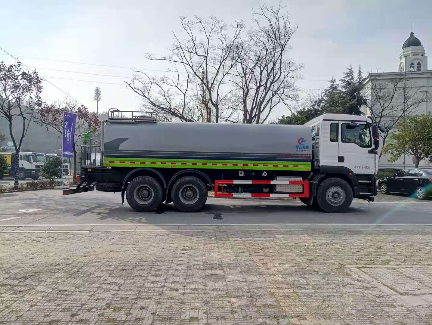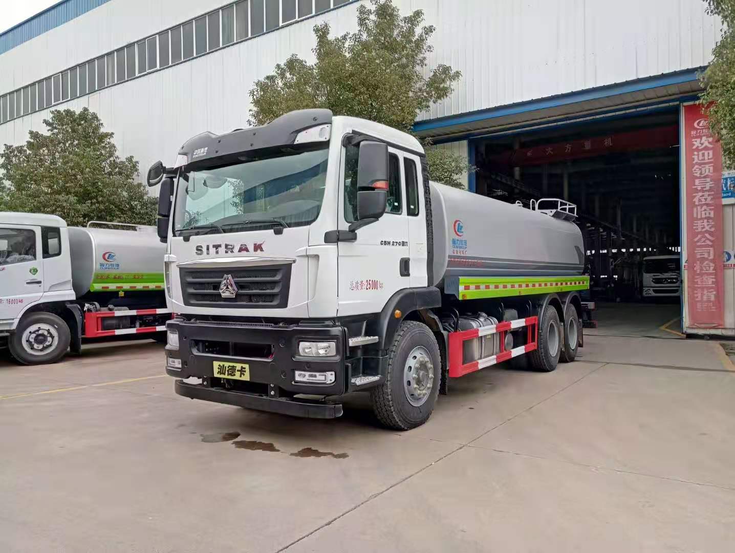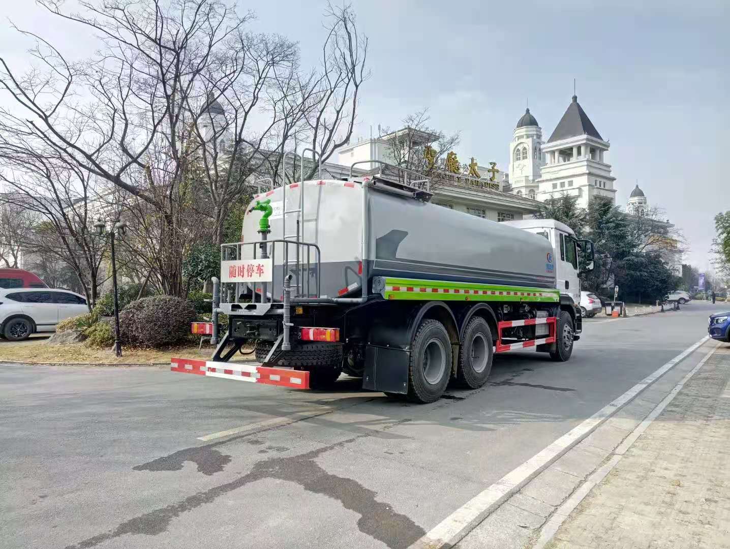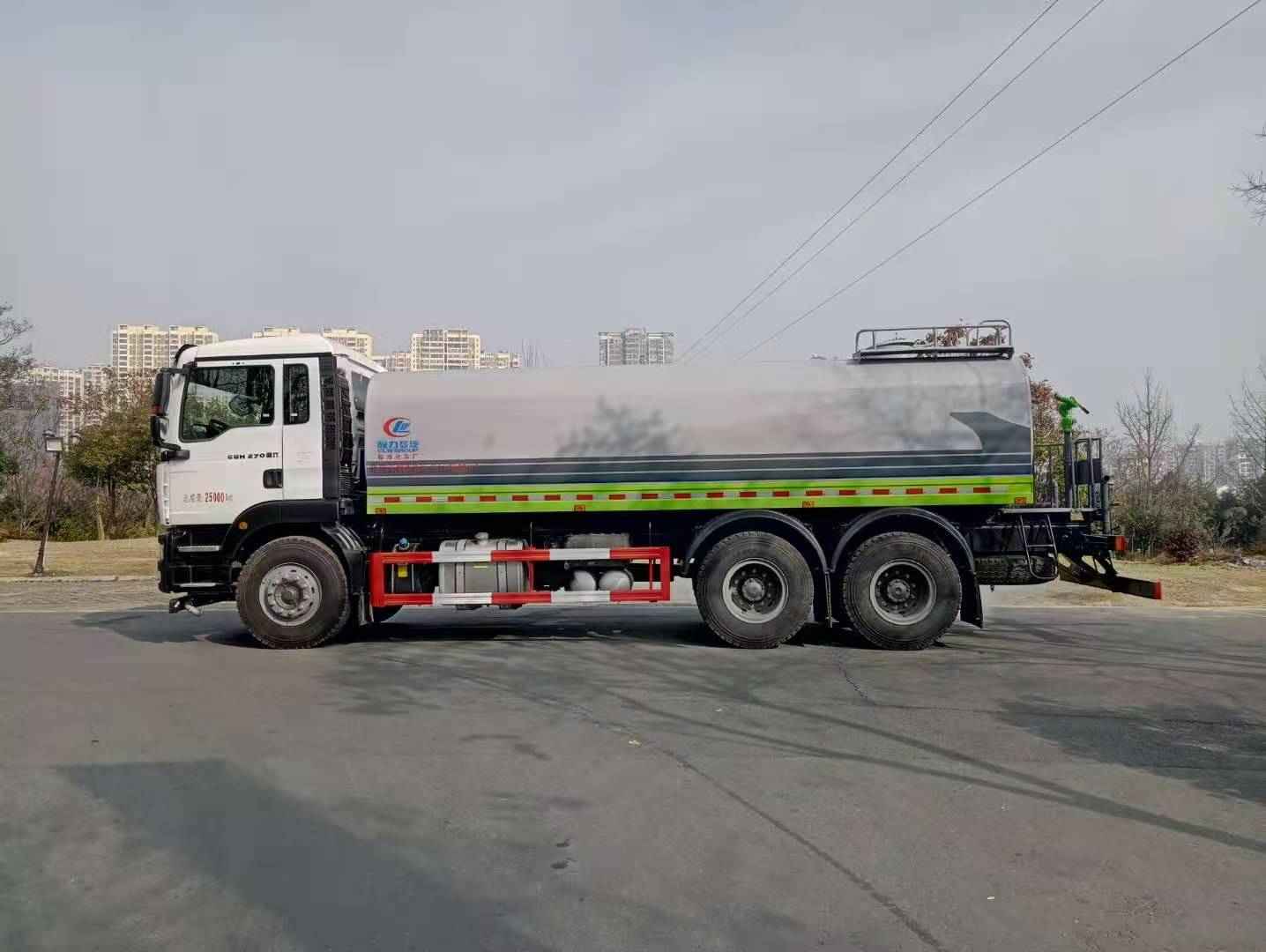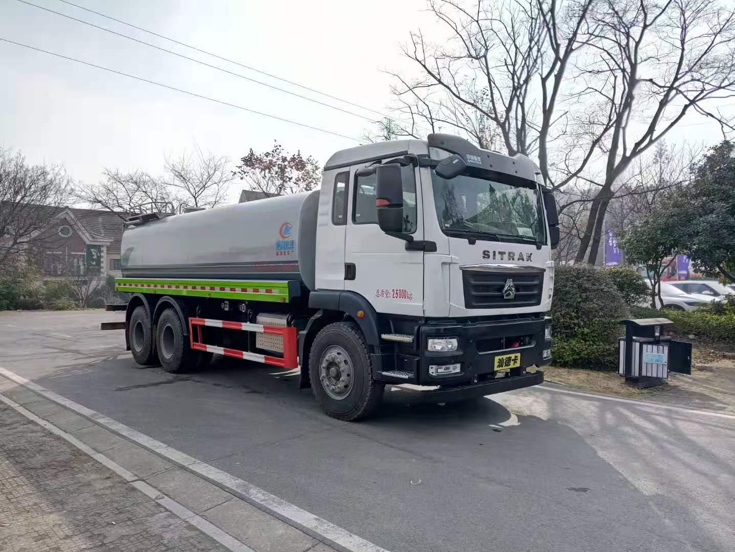 该车采用重汽汕德卡后双桥高端底盘,豪华驾驶室,气囊座椅,9档变速箱,中控锁,电动玻璃,液晶屏,电加热后视镜,多功能方向盘,方向助力,洒水车标配前冲(喷)后洒,洒水宽度18~20米,带侧喷,罐体后带工作平台,平台上安装绿化洒水炮,洒水炮可全方位旋转,射程≥35米,可连续调成直冲状、大雨、小雨、毛毛雨,带安全护栏,配备程力威专用洒水泵,泵可自吸自排,安装过滤网,带消防接口,可通过消防栓进水,带自流阀,具有自吸自排功能,垂直吸≥6米;随车选装20米绿化卷盘,可喷洒农药,罐体金属漆。选装消防泵,射程50米。 洒水车同时具有运水功能,若运饮用水,罐体内需做防腐油漆,洒水车泵可起到吸水和加压排功能,也可不通过泵排水。